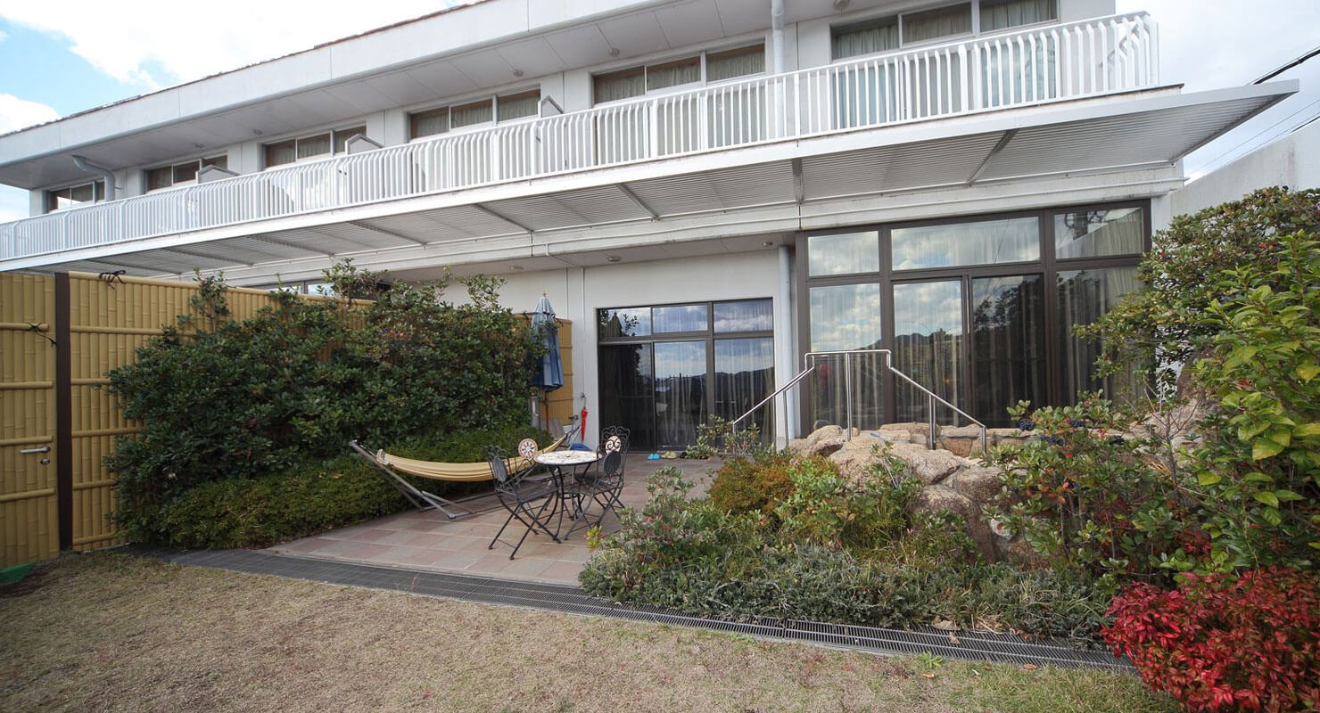 ガラス張りの窓の外にはプライベートデッキがあり、ガーデンチェアーを設置。